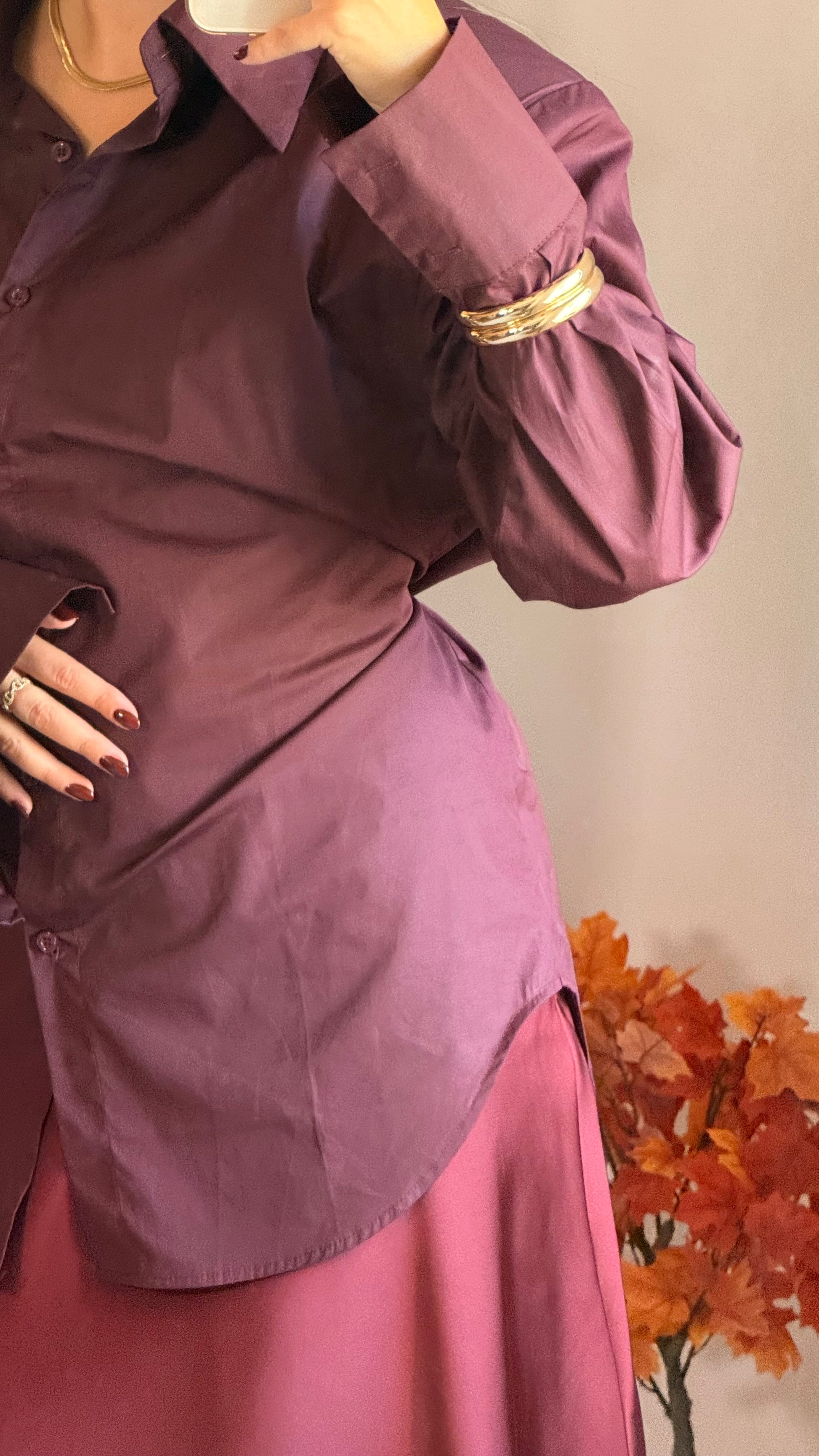 La chemise a une coupe oversize mais comporte deux cordons pour ajuster celle ci à la taille. Le modèle porte une taille S/M.