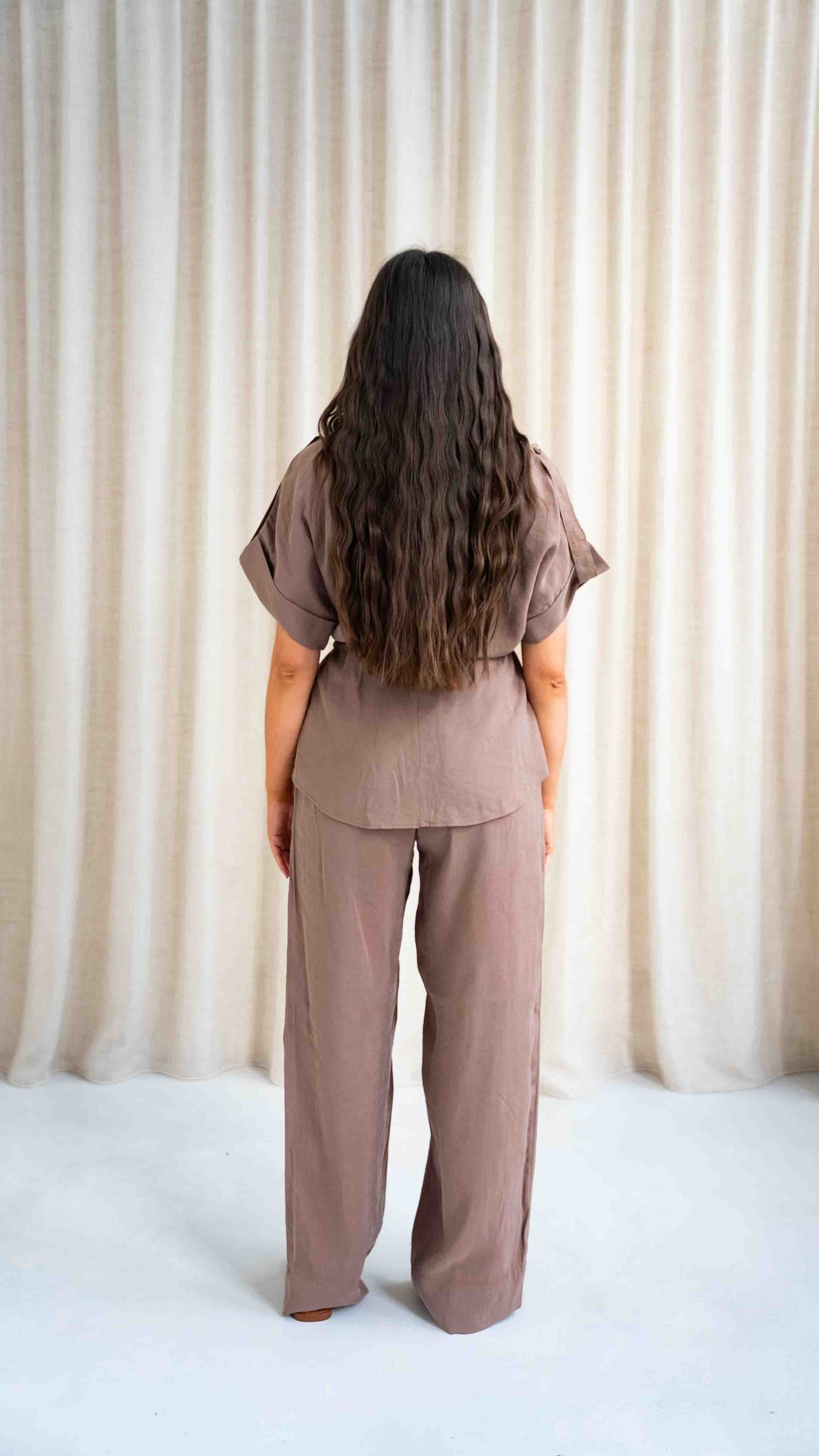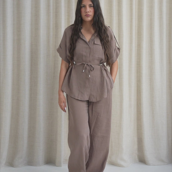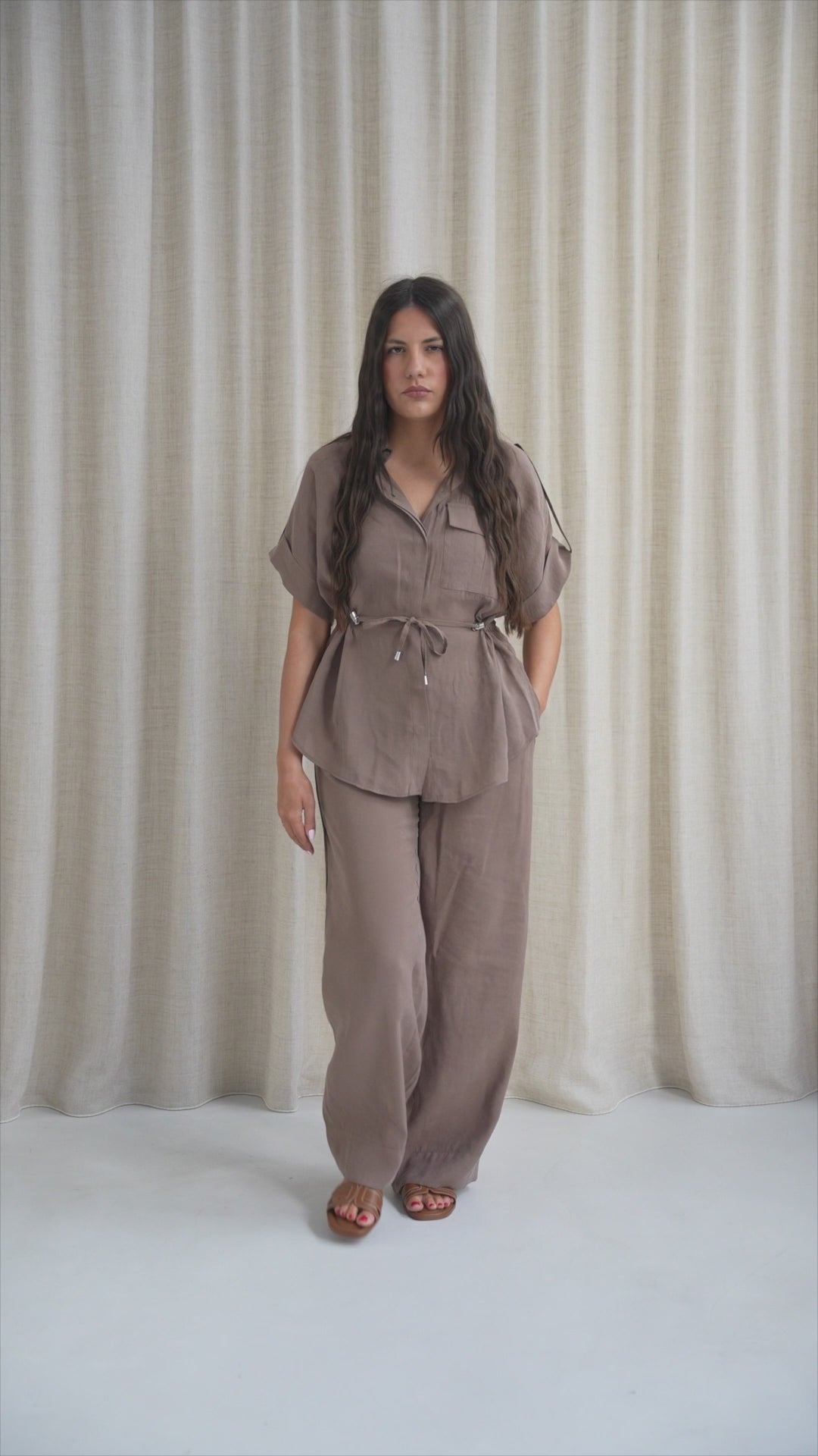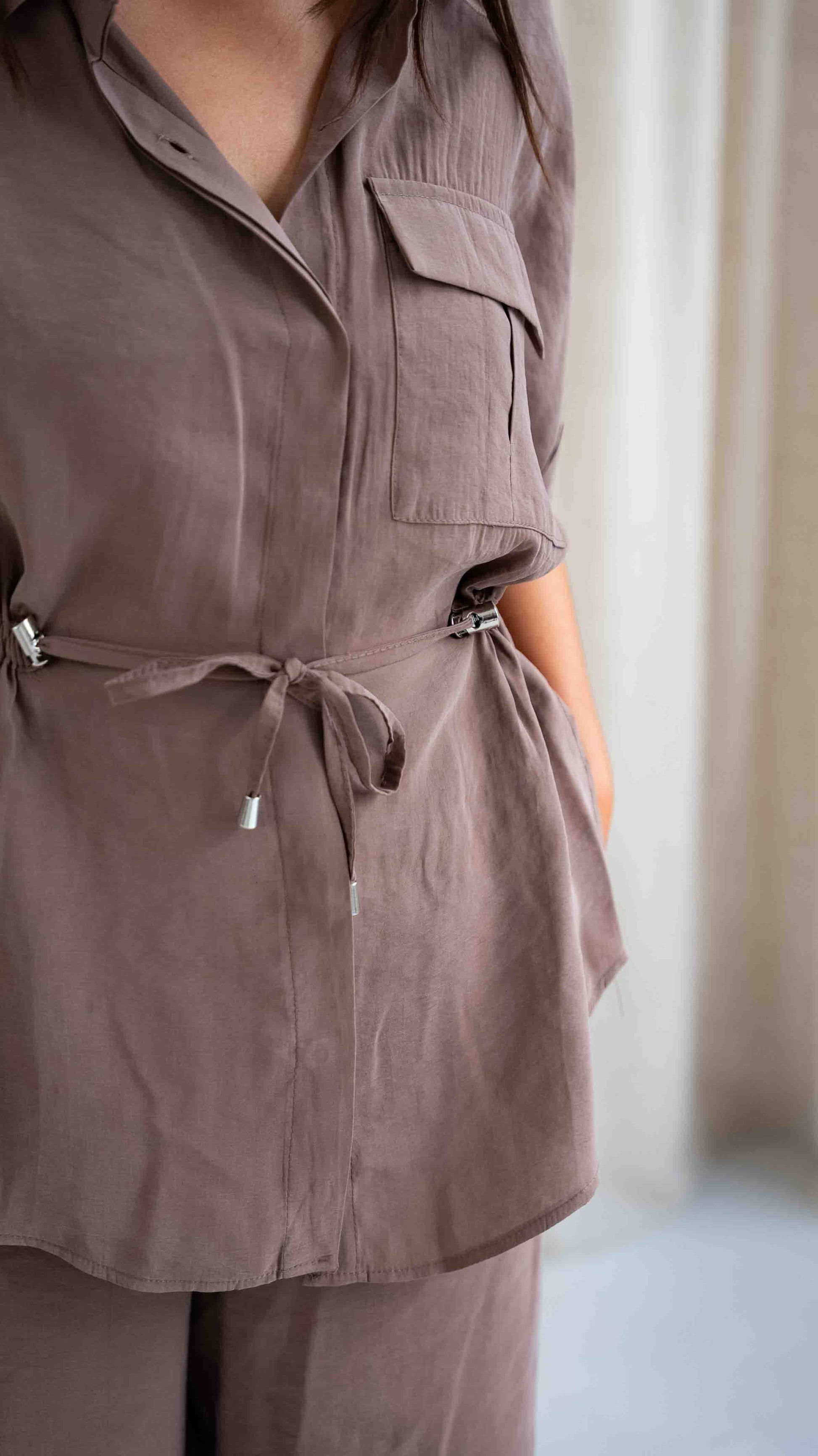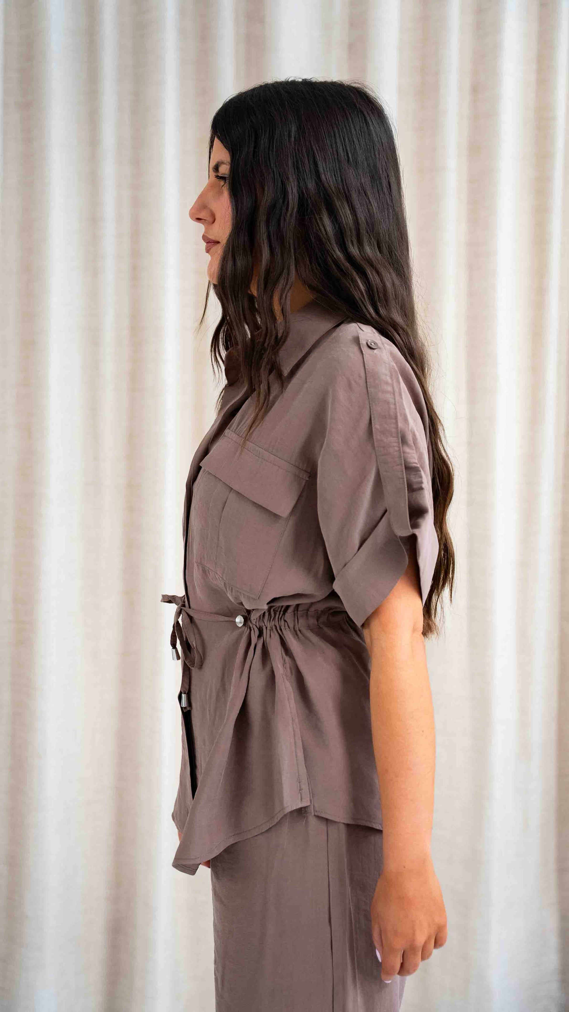 Le modèle porte une taille S et mesure 1m63. La chemise dispose de cordons à la taille qui sont ajustables pour réaliser cet effet cintré.