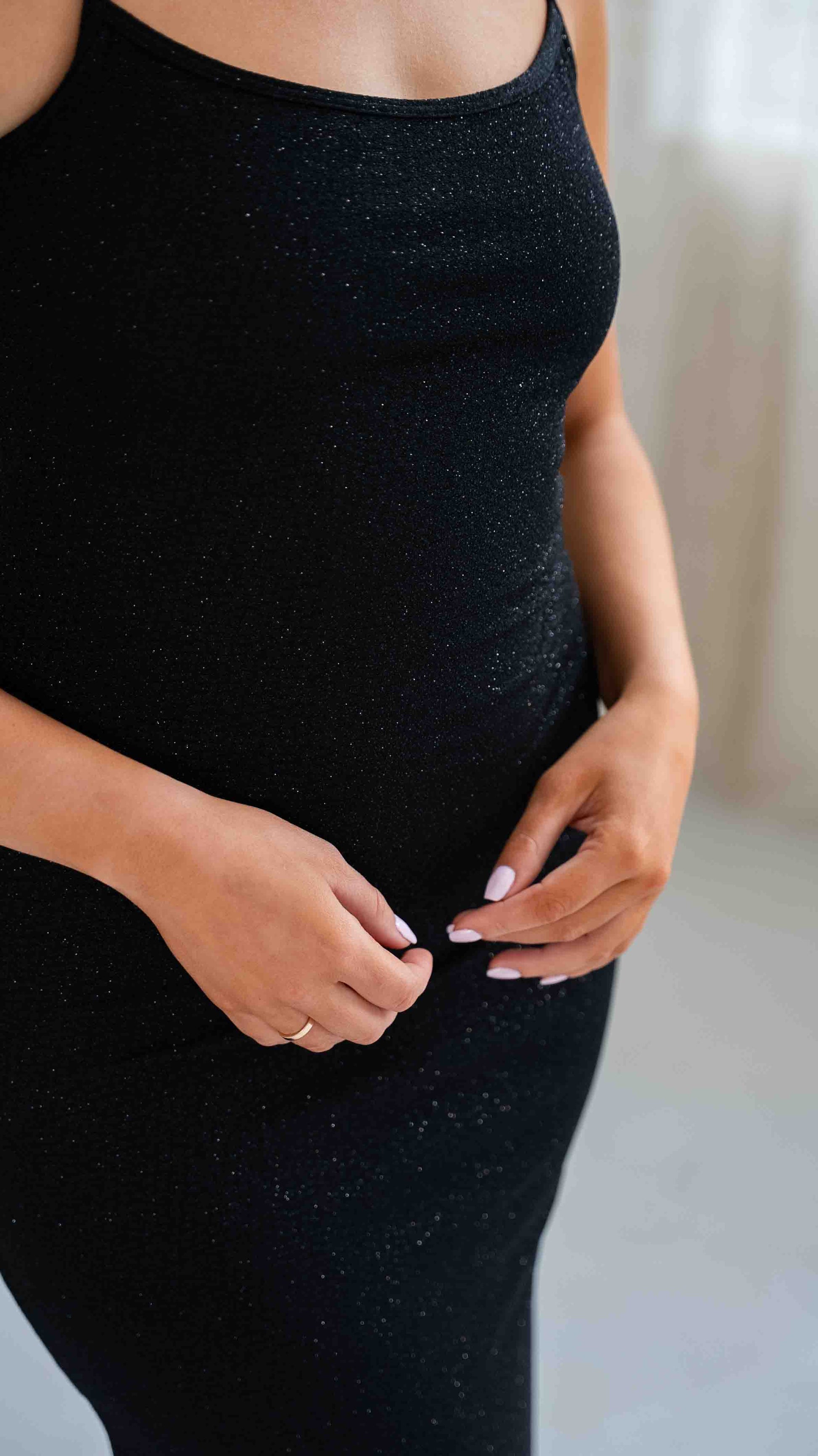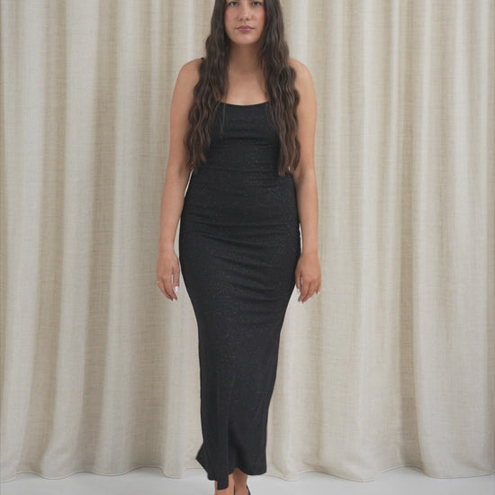 Le modèle porte la robe en taille M et mesure 1m63. La robe est doublée et a une fente à l’arrière.